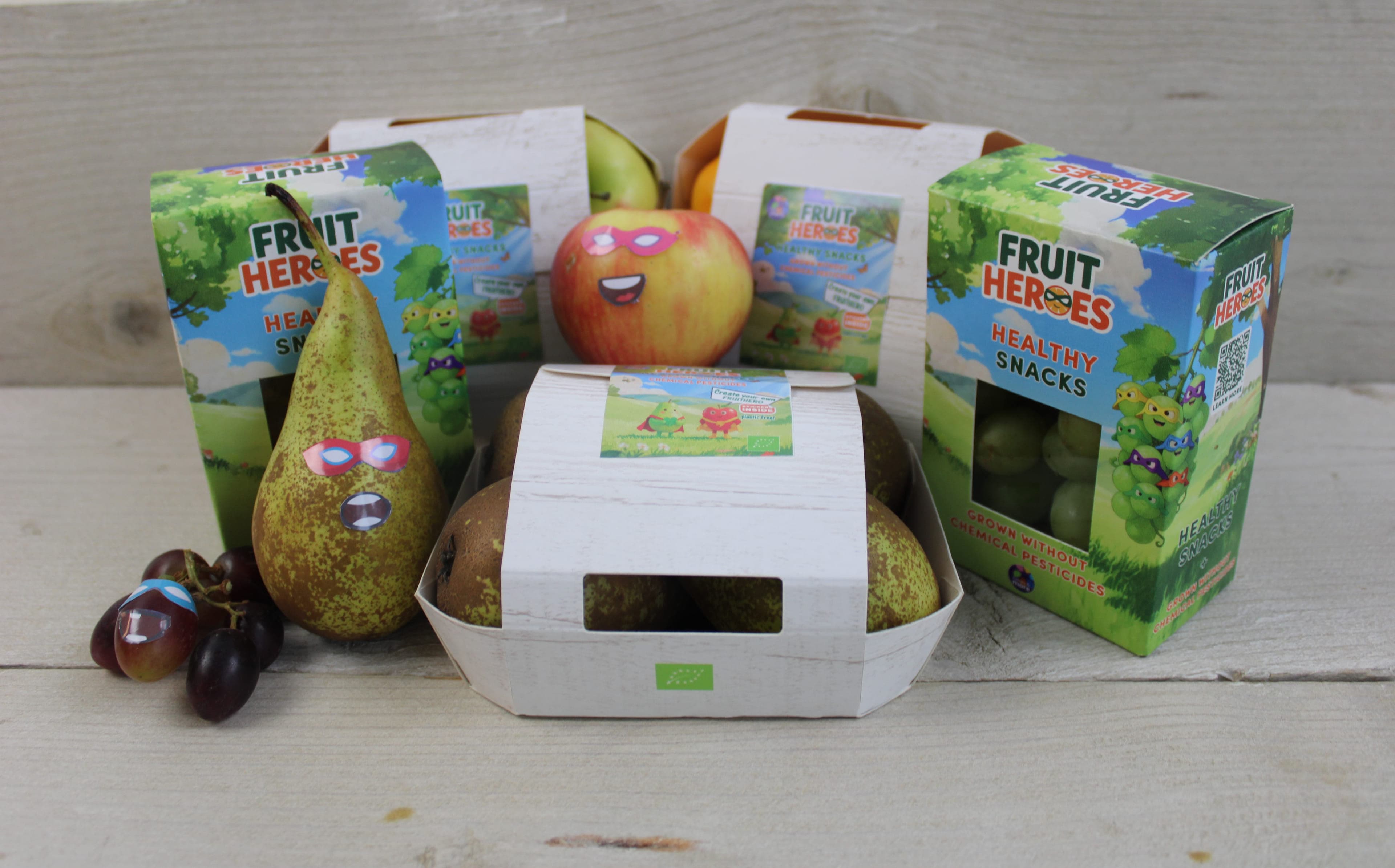 Organic Fruit Heroes is een assortiment 100% vers, 100% biologisch fruit, geteeld zonder chemische pesticiden en speciaal ontwikkeld voor kinderen. Uitgangspunt zijn de top 10 favoriete fruitsoorten van kinderen, zoals appels, mandarijnen, peren, druiven, kiwi’s, perziken en abrikozen, afhankelijk van het seizoen. De producten worden verpakt in opvallende doosjes met plasticvrije stickers die kinderen kunnen verzamelen of gebruiken om hun eigen ‘fruithelden’ te maken.